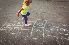 Como brincar: Material: Giz para desenhar a amarelinha no chão e uma pedrinha para lançar nos quadrados.